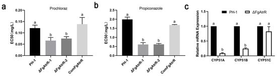 AtrR is an important regulator of azole resistance in A. fumigatus []. To investigate whether FgAtrR is involved in the response to azole chemicals in F. graminearum, we determined the sensitivity of the wild-type PH-1, ΔFgAtrR, and ComFgAtrR strain to the azole fungicides prochloraz and propiconazole. The EC50 value of prochloraz for wild-type PH-1 was 0.121 ± 0.013 mg/L, whereas it was 0.066 ± 0.014 mg/L and 0.075 ± 0.009 mg/L for each deletion mutant, which was only approximately 60% of that for the wild-type strain (Figure 5a and Figure S6a). Similar results were also obtained in the sensitivity test to propiconazole. The EC50 value of propiconazole for the deletion mutants (0.610 ± 0.104 mg/L and 0.617 ± 0.046 mg/L) was decreased to only approximately 30% of that for the wild type (1.990 ± 0.125 mg/L) (Figure 5b and Figure S6b). These results implied that deletion of FgAtrR significantly decreased the resistance of F. graminearum to prochloraz and propiconazole. The 14α-demethylase CYP51 is the main target of azole fungicide, so we further evaluated the transcription levels of three CYP51 paralogous genes, CYP51A, B, and C, in F. graminearum. The results showed that compared to those in PH-1 strain, the expression of CYP51A was barely detectable, and CYP51B and CYP51C were downregulated by 66.2 ± 3.6% and 54.2 ± 2.7%, respectively, in ΔFgAtrR (Figure 5c), which suggested that FgAtrR has a critical role in the transcriptional regulation of CYP51 genes in F. graminearum.