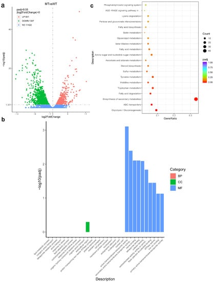 Transcriptome analysis of Fusarium graminearum wild-type strain PH-1 (WT) and FgAtrR deletion mutant strain (MT). (a) Volcano plot of identified transcripts. The dots in the upper left corner (labeled in green) are transcripts that were downregulated in the ΔFgAtrR strain, while the dots in the upper right corner (labeled in red) indicate those that were upregulated. (b) GO enrichment analysis of the downregulated genes in the ΔFgAtrR strain showed that 8 GO terms in molecular function (MF) were significantly enriched (padj < 0.05). Detailed data are listed in Table S3. (c) KEGG enrichment analysis of the downregulated genes in the ΔFgAtrR strain showed that 7 KEGG pathways were significantly enriched (padj < 0.05). Detailed data re listed in Table S4.