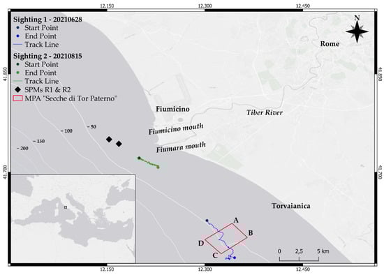 Map of the study site. The red rectangle represents the marine protected area “Secche di Tor Paterno” while the two diamonds represent the Single Point Moorings R1 and R2. The map also shows start and ending points (dots) and tracks (lines) of the first (blue) and the second (green) sighting.