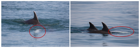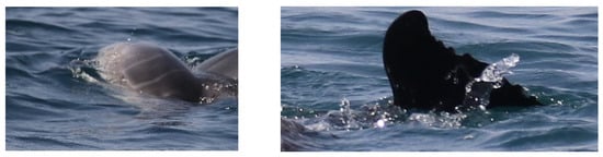 The escorting individual UNIRM_025 directly participated in the supportive behavior, passing over the carcass (Figure 9 left picture). When not directly providing aid, UNIRM_025 remained close to the pair, swimming next to UNIRM_142 (Figure 9 right picture). This behavioral pattern continued until the end of the sighting (the research team decided to leave the animals after about four hours spent in documenting the event). Again, the carcass was not recovered, nor any attempt made to obtain it, to not disrupt the putative mother’s behavior, considering that both UNIRM_142 and UNIRM_025 were still fully interacting with the dead calf.