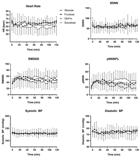 Glu, Fru and GluFru showed significantly higher heartrates over the course of each study visit compared to Suc independent of the amount of 300 mL. Post-prandial increments in heart-rate, cardiac output and stroke volume have been shown previously in relation to the meal content of fat, protein and carbohydrates []. The underlying mechanisms are unclear, but may potentially be attributed to the body’s response to ingested glucose []. The initiated cascade through the action of insulin and its vasodilatory properties may also induce sympathetic activity. This could also be confirmed by parameters of cardio-autonomic response in our study since, SDNN, RMSSD and pNN50 were lower after consumption of Glu, Fru or GluFru in comparison to the placebo. In addition, changes in systolic and diastolic blood pressure were also found, however, as demonstrated in Figure 1, these changes are significantly different between groups. However, the clinical importance is negligible and coincides what was shown by Heseltine et al. and by Sauder et al. that highlighted that independent of meal content hemodynamic changes are only partly affected [,].