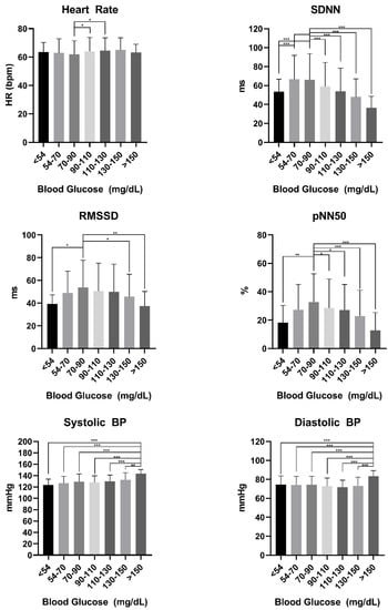 Indicates the glycemic range. BP: Blood pressure. ms: Milliseconds * indicates p < 0.05. ** indicates p < 0.01, *** indicates p < 0.001.