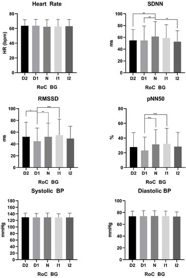 Indicates the rate of change (RoC) in BG. D2: Decrease in BG >10 mg/dL within 5 min. D1: Decrease BG of 5–10 mg/dL within 5 min. N: Stable glucose, defined as a change of <5 mg/dL within 5 min. I1: Increase in BG of 5–10 mg/dL within 5 min (I1) I2: Increase in BG >10 mg/dL within 5 min. ms: Milliseconds BP: Blood pressure. * indicates p < 0.05. ** indicates p < 0.01, *** indicates p < 0.001.