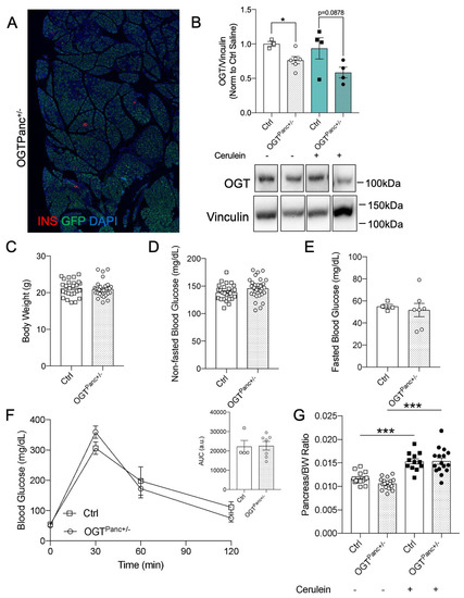 Body weight and glucose homeostasis did not differ between mice with reduced pancreatic OGT and controls. (A) Representative immunostaining image of a pancreas from an OGTPanc+/− mouse with Cre reporter GFP, insulin (red), and DAPI (blue). Magnification 10×. (B) Western blotting for OGT and Vinculin (loading control) and quantification of OGT over Vinculin, n = 3–6. (C) Body weight, (D) non-fasted, and (E) fasted blood glucose of mice before induction of pancreatitis at 8–10 weeks (n = 26–33 for (C,D) and n = 4–7 for (E)). (F) IPGTT and calculated AUC (n = 4–7). (G) Pancreas to body weight ratio following treatment with saline or cerulein (n = 12–17). (B–E) were presented as mean ± SEM, two-tailed t-test, and (G) was two-way ANOVA, p values, * p < 0.05, *** p < 0.001.