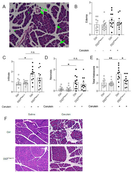 Mice with reduced pancreatic OGT had a decrease in the histological severity of pancreatitis. (A) Representative H&E image for scoring severity of pancreatitis of a control mouse treated with cerulein. Edema disrupted and separated acini (solid arrows), inflammatory infiltrate in the parenchyma and between lobules (dashed arrows), focal necrosis (asterisks). Magnification 20×. Histological scoring of (B) edema, (C) inflammatory infiltrate, and (D) necrosis, respectively, on a scale of 0–3 (n = 9–12). (E) Cumulative histoscore for the severity of pancreatitis (n = 9–12 animals). (F) Representative H&E images for each genotype and treatment group. Magnification 20×, scale bar 100 µm. (B–E) were presented as mean ± SEM, one-way ANOVA. p values, * p < 0.05, ** p < 0.01.