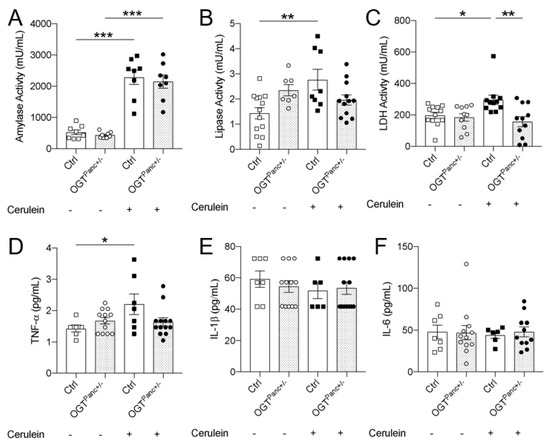 Lipase, LDH, and TNF-α did not increase in OGTPanc+/− mice treated with cerulean. (A) Serum amylase (n = 8), (B) lipase (n = 7–13), and (C) LDH (n = 10–13) as well as (D) serum cytokine levels of TNF-α, (E) IL-1β, and (F) IL-6 (n = 6–13) following treatment with saline or cerulein. (A–F) were presented as mean ± SEM, one-way ANOVA. p values, * p < 0.05, ** p < 0.01, *** p < 0.001.