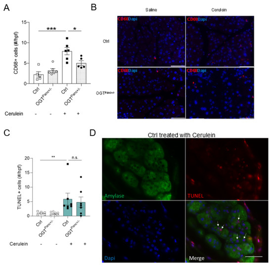 We next aimed to quantify and characterize the pancreatic immune infiltrate by identifying macrophages using the CD68 cell marker. There was a marked increase in the inflammatory infiltrate in the control mice that received the cerulein treatment, as indicated by increased macrophage presence (p ≤ 0.001). However, there was no change between the saline and cerulean treatment in OGTPanc+/− mice (Figure 4A,B). Within the cerulein treatment group, OGTPanc+/− mice had a significantly lower macrophage count in comparison to the control mice (p = 0.02). Next, cell death was assessed using a TUNEL assay, which showed a significant increase with induction of pancreatitis by cerulean in the control mice (Figure 4C,D). However, there was a non-significant difference in cell death between the OGTPanc+/− mice and mice treated with saline or cerulein.