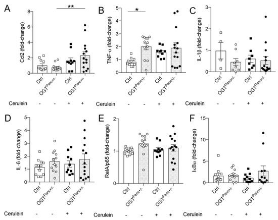 Pro-inflammatory mediators are involved in the pathophysiology of AP, and TNF-α, IL-6, IL-1β, and monocyte chemoattractant protein-1 (MCP-1/Ccl2) have been shown elevated in the plasma of patients with AP. To further evaluate the local inflammatory signaling response, mRNA levels of key chemokines and cytokines from pancreatic tissue were assessed. There was a significant increase in Ccl2 mRNA for OGTPanc+/− mice treated with cerulein (p = 0.03), which was not evident in controls (Figure 5A). An increase in pancreatic mRNA levels of TNF-α was evident between control and OGTPanc+/− mice at basal (Figure 5B). However, with cerulein treatment, a trend toward increased TNF-α was observed in control mice (Figure 5B). IL-1β and IL-6 mRNA levels were comparable between genotype and treatment groups (Figure 5C,D). Given the importance of the NFκB pathway in the pathophysiology of pancreatitis, mRNA levels for the key transcription factor RelA and the inhibitory protein IκBα were measured. With this approach of assessing the NFκB pathway, there was no difference in the transcription levels of RelA or IκBα (Figure 5E,F).