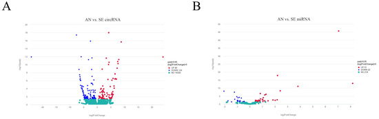 We identified 214 DE circRNAs between the AN and SE libraries, within which 90 were upregulated and 124 downregulated (Figure 2A). We also identified 53 DE miRNAs between the AN and SE libraries, within which 31 were upregulated and 22 downregulated (Figure 2B). Detailed results are provided in Supplementary Table S3.
