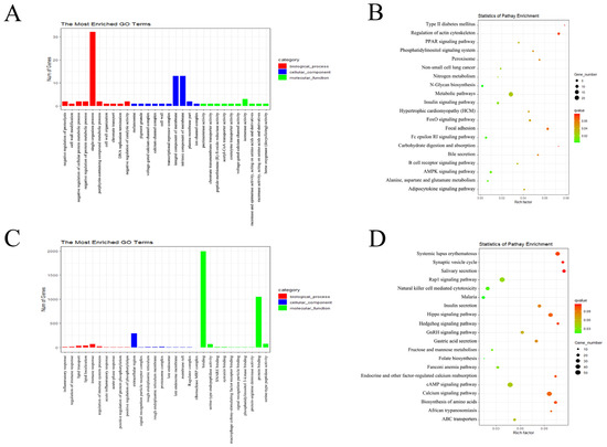 Top annotated GO terms (A) and top enriched KEGG pathways (B) of source genes of DE circRNAs. Top annotated GO terms (C) and top enriched KEGG pathways (D) of target genes of DE miRNAs.