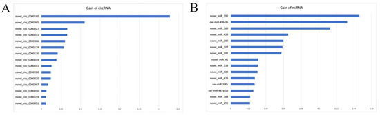 Gain value of top circRNAs (A) and miRNAs (B) selected by Random Forest-XGBoost.