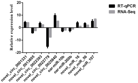 The comparison of the expression level of circRNAs and miRNAs selected for verification of the accuracy of sequencing between RNA-Seq and RT-qPCR are shown in Figure 6. The results indicated that selected circRNAs and miRNAs showed similar expression patterns between RNA-Seq and RT–qPCR, suggesting the reliability of our sequencing data.