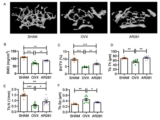 The effects of L. brevis AR281 on bone quality: (A) three-dimensional images of distal femur; (B) BMD; (C) BV/TV; (D) Tb.Th; (E) Tb.N; (F) Tb.Sp. Data are shown as mean ± SEM (n = 8 per group, except n = 7 in the SHAM group) and are normally distributed. * p < 0.05, ** p < 0.01, and *** p < 0.001.