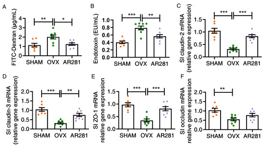 The effect of L. brevis AR281 on the gut epithelial permeability of ovx mice was investigated via the detection of the fluorescein isothiocyanate (FITC) dextran and serum endotoxin (Figure 2A,B). There was a significant increase in the levels of serum FITC-dextran (p < 0.01) and endotoxin (p < 0.001) of ovx mice, compared with those of mice not treated with ovx. However, oral gavage of AR281 in ovx mice significantly suppressed the levels of FITC-dextran (p < 0.05) and endotoxin (p < 0.01), compared with those of ovx mice not treated with probiotics. Moreover, ovx mice exhibited significantly downregulated (p < 0.01) expression levels of tight junction proteins, including claudin-2, claudin-3, ZO-1, and occludin (Figure 2C–F). However, oral gavage of AR281 in ovx mice exhibited significantly upregulated expression profiles of the first three factors (p < 0.01), compared with those of ovx mice not treated with probiotics. Therefore, AR281 exhibited a protective effect on the intestinal barrier integrity in ovx mice.
