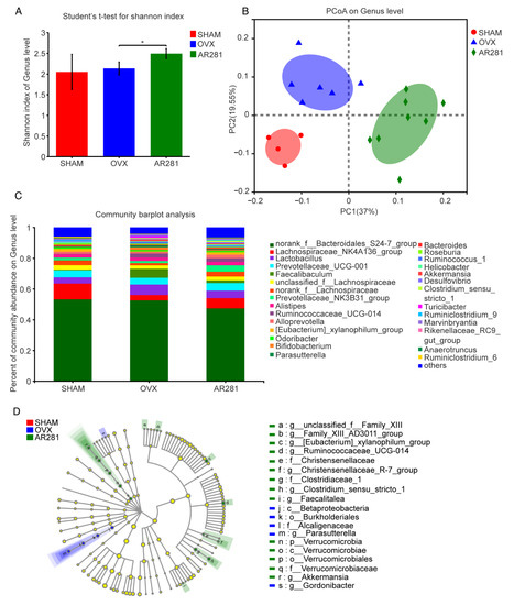 The effects of L. brevis AR281 on intestinal microbial variation: (A) Shannon index of the genus level; (B) principal coordinates analysis (PCoA) plots of fecal microbial communities based on abundance Jaccard distance; (C) community bar-plot analysis of the fecal microbiota; (D) linear discriminant analysis effect size (LEfSe) of fecal microbial communities among groups. n = 4, 6, or 8 in SHAM, OVX, or AR281, respectively. * p < 0.05.
