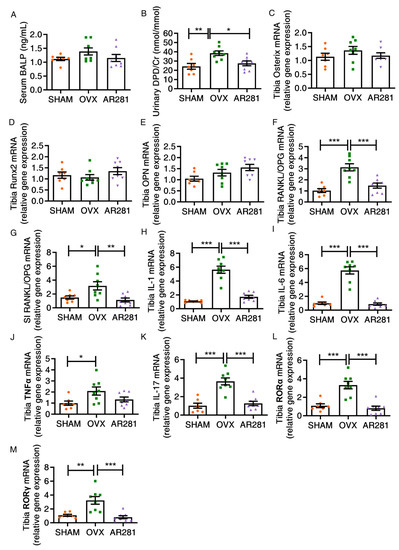 We examined the biomarkers of bone formation and resorption (Figure 5A,B). The marker of bone formation BALP did not change after different treatments. However, ovx mice exhibited a significant increase in the bone resorption marker DPD compared with that of mice not treated with ovx. AR281 treatment significantly inhibited (p < 0.05) ovx-induced increase in DPD. Moreover, the treatments failed to affect the expression of factors related to bone formation, including osterix, Runx2, and osteopontin (OPN), among the different groups (Figure 5C–E). However, there was a significant growth in the osteoclastogenic activator ratio of RANKL to OPG (RANKL/OPG), both in the bone marrow (p < 0.05) and small intestine (p < 0.001) of ovx mice, compared with those of mice not treated with ovx (Figure 5F,G). AR281 treatment significantly inhibited RANKL/OPG in the tibia (p < 0.001) and the small intestine (p < 0.01) compared with that of ovx mice not treated with probiotics. Furthermore, ovx mice exhibited significantly increased levels (p < 0.05) of osteoclastogenic cytokines in the tibia, including IL-1, IL-6, and TNFα, compared with those of mice not treated with ovx (Figure 5H–J). However, oral gavage of AR281 in ovx mice exhibited a decrease (p < 0.001) in the production of IL-1 and IL-6 in the tibia, compared with those of ovx mice not treated with probiotics. Oral gavage of AR281 in ovx mice failed to significantly affect the expression of TNFα in the tibia. Moreover, ovx mice exhibited significantly increased levels (p < 0.01) of IL-17-related pro-osteoclastogenic cytokines in the tibia, including IL-17, RORα, and RORγ, compared with those of mice not treated with ovx (Figure 5K–M). However, oral gavage of AR281 in ovx mice significantly inhibited (p < 0.001) the three factors of the tibia, compared with those of ovx mice not treated with probiotics. Overall, supplementation of AR281 significantly suppressed osteoclastogenic cytokines in both the small intestine and tibia.