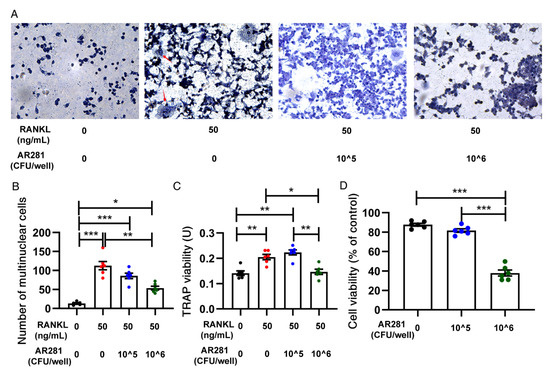 The effect of L. brevis AR281 on osteoclast differentiation from RAW264.7 cells: (A,B) the number of multinucleated cells under a light microscope (original magnification ×200); (C) the tartrate-resistant acid phosphatase (TRAP) activity; (D) the viability of RAW264.7 cells when they were co-cultured with different concentrations of AR281. Data are shown as mean ± SEM (n = 6) and are normally distributed. * p < 0.05, ** p < 0.01, and *** p < 0.001.