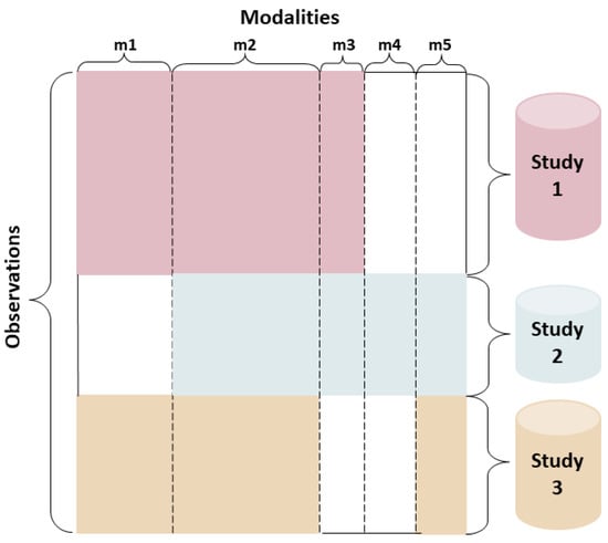 Multimodal data fusion [14] allows different datasets or different feature subsets of an object to be combined to describe the object comprehensively and accurately. The proposed research contributes to the young but growing field of multimodal data fusion with shared and unshared (modality-specific) data elements. Using heterogeneous datasets from disparate sources often lead to data blocks with partially shared features where observations (e.g., patients) from different sources differ in terms of the feature sets. Augmented multimodal setting allows an arbitrary collection of heterogeneous data sources to be partially coupled (i.e., one-to-one correspondence) through shared entities [23], which is illustrated in Figure 1. When multiple datasets (i.e., sources) with different modalities concerning an object exists, they cannot be simply merged into a single matrix for complementation of missing values due to each dataset having different distributions or feature dimensions. Traditional methods, such as coupled matrix and tensor factorization [24,25,26,27], and context-aware tensor decomposition [28], are used for joint matrix factorization analysis of partially coupled data from multiple platforms by transferring the similarity between object pairs learned from one dataset to the other for more accurate complementation of missing values.