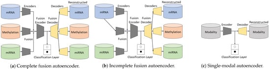 The overview of our proposed architectures. As the backbone, the complete fusion autoencoder (a) has three separate encoders for the modalities, i.e., encoder 1, encoder 2, and encoder 3. The fusion encoder then merges the learned representations from each thread for latter usage. Without losing generality, encoder 2 in (b) takes the first modality as input, to learn the correlation between mRNA and methylation. (c) simply takes every individual modality as input, respectively.
