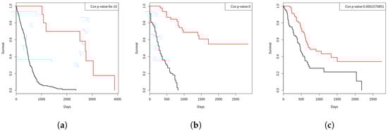 The Kaplan–Meier survival curves of the three cancers generated using our labeling strategy, indicating the reliability of our ground-truth labels. Here the black curves are representing the short-term survivors and the red curves are representing the longer-term survivors. (a) GBM. (b) LAML. (c) PAAD.