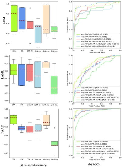 Figure 5 shows that inferring the highly predictive missing modality through the proposed data fusion model allows the construction of a predictor (IFA) that achieves comparable performances to CFA using all actual modalities, and is better than the baseline models that use only the two available modalities (CFA-2M) or a single modality (SMA-, SMA-). Since we have constructed a fully controlled simulated study, we are able to demonstrate the performance of SMA- (and, hence, CFA) in Figure 5a, which in practice would be absent. Results have further shown that certain modalities (i.e., DNA methylation, also referred to as SMA-) carry more predictive information than others on specific cancers as can be seen in Figure 5a (for LAML and PAAD). The proposed study, therefore, is able to learn the latent representation of a modality with strong predictive capability that is completely missing in one source through another data source that carries shared entities. Specifically, the area under the ROC curve (AUC) reported in Figure 5b is calculated based on the averaged TPR values (across 5-fold runs) and linearly interpolated FPR values. Both balanced accuracy and AUC performances of our proposed models confirm the IFA’s ability to successfully fuse the knowledge learned from the missing modality. A t-test is applied to compare the performances of IFA with CFA-2M, SMA-, SMA- across 100 runs on GBM and the results further confirmed that the distributions of balanced accuracies are significantly different with p-values of 0.04, <0.0001, and <0.0001, respectively. Similar significance levels are observed when the IFA models are compared with other baselines on LAML and PAAD except for LAML in which no significant difference between IFA and CFA-2M is noted.