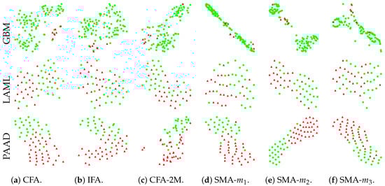 We show the t-SNE plots in Figure 6 for the compressed (and fused for further multimodal prediction) features in our baseline models. The same testing sets from one of the 5-fold cross-validation analyses are used for fair comparison across models. The plots show that the two patient subgroups in the latent space are well separated for both CFA (Figure 6a) and IFA (Figure 6b) models, while CFA-2M (Figure 6c) performs less optimal separation when compared with the other two models, indicating the proposed IFA’s ability to identify the short- and long-term survivors as accurately as CFA. For SMA using single modalities (Figure 6d–f), only the most predictive modality (i.e., DNA methylation) shows relatively well separated results as shown in Figure 6e. Figure 6 also indicates that our proposed models can accurately and robustly compress the multimodal and high-dimensional data with extremely limited sample size through conventional deep learning methods.