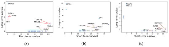 We have further identified mutations that are highly abundant in the short-term survival group, but not in the long-term survival groups for the three cancers. The results are reported in Figure 7. Here, each point represents a gene, and the coordinates are representing the number of patients having at least a variant in that gene for long- vs. short-term survivors. In principle, we are mostly interested in genes that are highly mutated in one group and not in the other which corresponds to the top-left and the bottom-right corners of the graph.