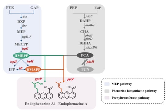 In addition to PCA, DMAPP is also an essential precursor for the biosynthesis of endophenazine A, which is produced via two pathways: the 2-methyl-D-erythritol-4-phosphate (MEP) pathway and the mevalonate (MVA) pathway. Consistent with most bacteria, Pseudomonas only possesses the MEP pathway [26]. The MEP pathway, called the non-mevalonate (MVA) pathway, begins with pyruvate and glyceraldehyde 3-phosphate (GAP), and followed by continuous enzyme catalysis to synthesize 2-C-methyl-D-erythritol 2, 4-cyclodiphosphate (MECPP) [27]. Next, MECPP is catalyzed by 4-hydroxy-3-methyl-2-butene pyrophosphate (HMBPP) synthase (IspG) to HMBPP, which is reduced to isopentenyl pyrophosphate (IPP) and DMAPP by HMBPP reductase (IspH) [28]. In the last step, IPP and DMAPP can be reversibly converted by isopentenyl diphosphate isomerase (IDI) [29] (Figure 1). Due to the limitation of isoprene precursors, many studies have improved the concentration of isoprene by increasing the expression of key enzymes. For example, overexpression of idi enhanced the production of lycopene and β-carotene up to 4.5 and 2.7 folds, respectively [30]. In addition, the role of genes ispG and ispH in the MEP pathway have been elucidated and could be the important rate-limiting steps to synthesize secondary metabolites [31].