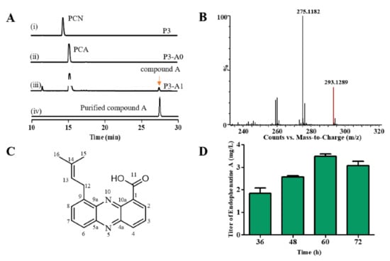 Endophenazine A was synthesized by P. chlororaphis with inserted ppzP gene. (A) HPLC profiles of P3, P3-A0, and P3-A1 strains fermentation broth and purified compound A. (B) The UPLC-MS result of compound A. (C) The structure of compound A. (D) The concentration of compound A in P3-A1 in different culture time. P3: a mutant from P. chlororaphis HT66; P3-A0: deletion of phzH in P3; P3-A1: introduction of ppzP in the chromosome of P3.