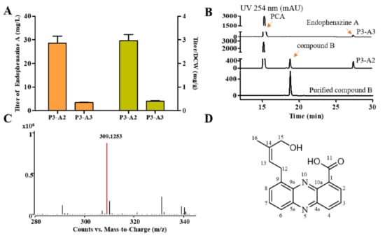 Influence of overexpression of ppzP on the titer of endophenazines. (A) The concentration of endophenazine A in strain P3-A2 and P3-A3. (B) HPLC profiles of P3-A2 and P3-A3 strains fermentation broth and purified compound B. (C) The UPLC-MS result of compound B. (D) The structure of compound B. P3-A2: overexpression of ppzP in P3-A1; P3-A3: integration of pBBR1MCS plasmid in P3-A1.