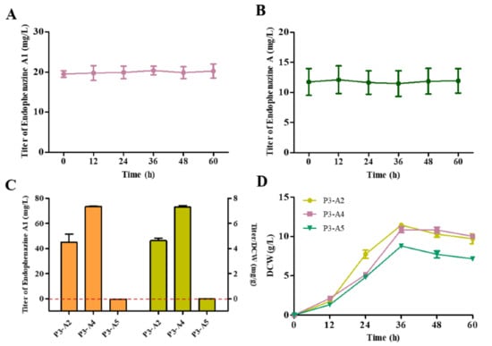 Endophenazine A1 was first isolated from Kitasatospora sp. HKI 714 [33], but its synthesis mechanism has not been elucidated. Since endophenazine A and endophenazine A1 are similar in structure, we first assumed that endophenazine A1 is an intermediate, which can be further reduced to endophenazine A, or endophenazine A might be unstable and can be oxidized to endophenazine A1. To test this hypothesis, we cultured strain P3-A0 in KB medium containing endophenazine A and endophenazine A1, respectively. However, the concentration of endophenazine A and endophenazine A1 did not decrease significantly after 60 h of incubation (Figure 4A,B). These results showed that endophenazine A1 and endophenazine A cannot interconvert in P. chlororaphis P3. Our other assumption was that the leakage of intermediate might cause endophenazine A1. In the MEP pathway, the intermediate HMBPP is almost the same as the isoprene unit of the endophenazine A1, so HMBPP may be the precursor of endophenazine A1. In order to investigate the effect of HMBPP concentration on the production of endophenazine A1, we co-expressed ispG and ispH with ppzP to obtain strains P3-A4 and P3-A5, respectively. Compared with strain P3-A2, the concentration of endophenazine A1 in strain P3-A4 increased by 62%, and the titer/DCW of endophenazine A1 was increased from 4.63 mg/g in P3-A2 to 7.32 mg/g in P3-A4. On the contrary, strain P3-A5 hardly synthesized endophenazine A1 (Figure 4C). The overexpression of the ispG gene had less effect on cell growth, while overexpression of the ispH gene had a significant inhibition on cell growth (Figure 4D). The above results revealed that HMBPP is the precursor for the synthesis of endophenazine A1, which provides different metabolic engineering strategies for subsequent improvement in the production of endophenazine A and endophenazine A1.