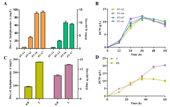 Effects of metabolic regulation and medium optimization on endophenazine A concentration (A,C) and cell growth (B,D) in P. chlororaphis P3. P3-A1: introduction of ppzP in the chromosome of P3; P3-A2: overexpression of ppzP in P3-A1; P3-A6: co-overexpression of ppzP and idi in P3-A1; P3-A7: co-overexpression of ppzP, idi, and ispH in P3-A1.