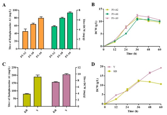 It has been proven that endophenazine A1 was a shunt pathway of endophenazine A. Therefore, we attempted to increase the production of endophenazine A1 by reducing the consumption of HMBPP and promoting the synthesis of HMBPP. The ispH gene is known to be necessary for bacterial growth and survival and cannot be deleted [34]. Therefore, we could not delete the ispH gene to block carbon flux from HMBPP to DMAPP. Previous results proved that overexpression of the idi gene promoted the flow of carbon flux to produce DMAPP, so we knocked out the idi gene in strain P3-A2 and obtained the strain P3-A8 to reduce the accumulation of DMAPP and increase the accumulation of HMBPP. As shown in Figure 6A, the production of endophenazine A1 in P3-A8 was 63.6 mg/L, which increased by 41% compared with P3-A2, and the titer/DCW of endophenazine A1 was increased from 4.63 mg/g in P3-A2 to 6.34 mg/g in P3-A8. Then, in order to increase the supply of precursor HMBPP, the ispG gene was co-overexpressed with ppzp in strain P3-A8 to get P3-A9, resulting in the production titer of 79.24 mg/L endophenazine A1, which was 24% higher than that of strain P3-A8, and the titer/DCW of endophenazine A1 was increased from 6.34 mg/g in P3-A8 to 7.45 mg/g in P3-A9 (Figure 6A). At the same time, these gene manipulations had no significant effect on cell growth (Figure 6B). Finally, the titer of endophenazine A1 in the Y medium of strain P3-A9 increased to 189.2 mg/L, which was 2.4 folds in the KB medium, and the titer/DCW of endophenazine A1 was increased from 7.45 mg/g in KB medium to 9.81 mg/g in KB medium (Figure 6C). The reason may be similar to the high production of endophenazine A (Figure 6D).