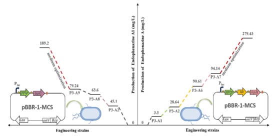 All strains and plasmids are shown in Table 1, and primers are listed in Table S2. P. chlororaphis P3 was obtained by chemical mutagenesis of P. chlororaphis HT66 with a high production of PCN [24]. P. chlororaphis strains were grown in 5 mL Luria-Bertani (LB) broth and shake flask fermented in 60 mL King’s B medium (KB) and Y medium (37.08 mL/L glycerol, 20 g/L tryptone, 25.03 g/L soy peptone) at 28 °C, 200 rpm.
