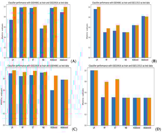 The results of the different performance metrics for each classifier are presented in Supplementary Table S1. With GSE44861 as training data and GSE20916 as test data, the random forest model achieved better performance with an accuracy of 98.2% and 90% using the bootstrap and LOOCV methods, respectively. With GSE44861 as training and GSE113513 as testing data, the logistic regression model achieved an accuracy of 96.4% and 84% using bootstrap and LOOCV, respectively. When we used GSE20916 as training data and GSE44861 as testing data, the naïve Bayes classifier achieved an accuracy of 90.1% and 96% using bootstrap and LOOCV, respectively. With GSE20916 as training data and GSE113513 as testing data, logistic regression resulted in better performance. With GSE113513 as training and GSE44861 as testing data, the ExtraTree classifier model achieved better performance. With GSE113513 as training data and GSE20916 as testing data, none of the models achieved good performance.