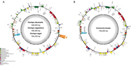 Chloroplasts are photosynthetic organelles in algae and land plants that have their own genomes. Chloroplast genomes are highly conserved because of uni-parent inheritance or maternal inheritance []. The sizes of chloroplast genomes in mangrove species are around 145–168 kb [,,,]. Chloroplast genomes in mangrove species usually contain four regions, including one large single-copy region (LSC), two inverted repeats (IRA and IRB), and one single small-copy region (SSC) [,,,]. To date, several chloroplast genomes have been reported because of the development of DNA sequencing technology and bioinformatics methods [,,]. For Ceriops and Avicennia species, only the chloroplast genomes of C. tagal and A. marina are available [,]. Therefore, both the Ceriops and Avicennia genera suffer from a lack of chloroplast genomes to compare their genomes and to understand phylogenetic relationships among them.