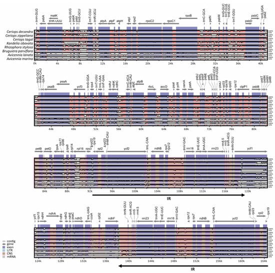 Alignment map of 8 mangrove chloroplast genomes in Rhizophoraceae and Acanthaceae. Horizontal axis is genome position, whereas vertical axis shows sequence identity. Grey arrows indicate genes and transcriptional directions, and black arrows indicate IR regions. Exons and conserved non-coding sequences (CNS) are shown in blue and red, respectively.