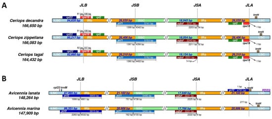 Comparison of IR boundaries of chloroplast genomes. (A) IR boundaries among three Ceriops species. (B) IR boundaries among two Avicennia species.