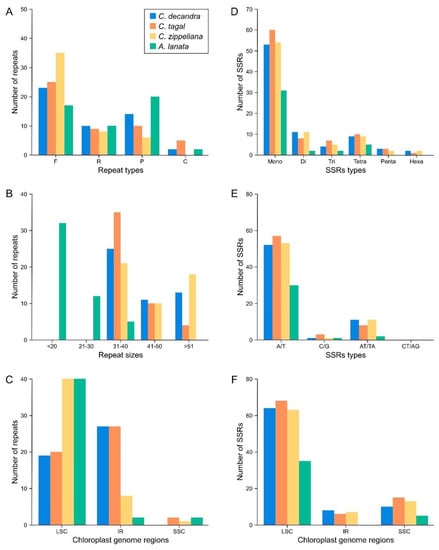 Statistical analysis of repeats and SSRs in four mangrove chloroplast genomes. (A) Sorted by type of repeat. (B) Frequency by repeat types. (C) Sorted by repeat region of genome. (D) Sorted by type of SSR. (E) Frequency by SSR type. (F) Sorted by SSR region of genome.