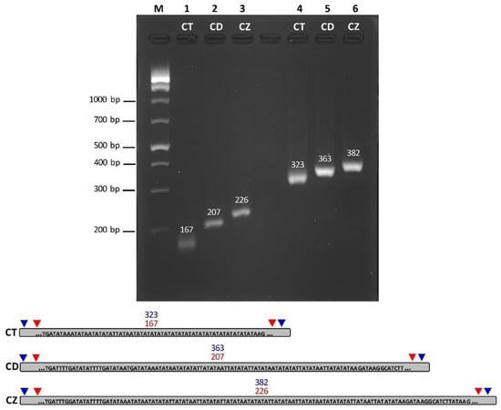 Analysis of PCR products by 1% agarose gel electrophoresis with graphical genomes positing primer pairs. PCR products were amplified with two primer pairs in three Ceriops chloroplasts. Lane M: DNA size marker; Lane 1: PCR product amplified with the first primer set in C. tagal (CT: 167 bp); Lane 2: PCR product amplified with the first primer set in C. decandra (CD: 207 bp); Lane 3: PCR product amplified with the first primer set in C. zippeliana (CZ: 226 bp); Lane 4: PCR product amplified with the second primer set in C. tagal (323 bp); Lane 5: PCR product amplified with the second primer set in C. decandra (363 bp); Lane 6: PCR product amplified with the second primer set in C. zippeliana (382 bp). Graphical genomes show a part of the IR region used for designing specific primers of three Ceriops species based on different SSRs. Red arrows indicate the position of the first primer set, whereas blue arrows indicate the position of the second primer set.