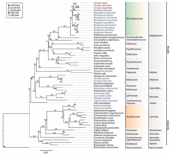 Maximum likelihood (ML) tree for 50 chloroplast protein-coding genes in 59 plant species. Values above the branches represent bootstrap with 1000 replicates. The mangrove species in this study are indicated in red text, whereas other mangrove species are indicated in blue text. The Rhizophoraceae lineage is indicated in gradient green, and the Acanthaceae lineage is indicated in gradient orange. Gain and loss of the rpl32, rps16, and infA genes are shown in different symbols and colors.