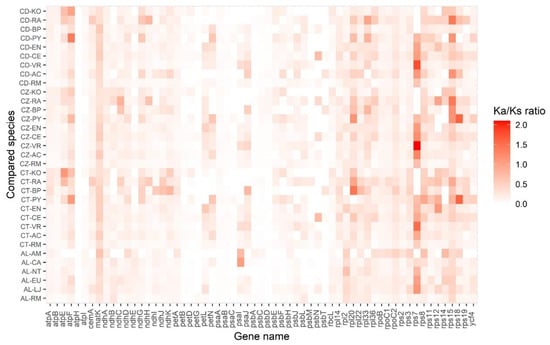A total of 61 shared chloroplast protein-coding genes were used to investigate selection pressures for two mangrove genera, Ceriops and Avicennia (Table S3). We compared species pairs contained between the three Ceriops species and six relative mangrove and non-mangrove species (Kandelia obovata (NC_042718), Rhizophora apiculata (MW387538), Bruguiera parviflora (MW836113), Pellacalyx yunnanensis (NC_048998), Erythroxylum novogranatense (NC_030601), and Ranunculus macranthus (NC_008796)) as well as between A. lanata and six relative mangrove and non-mangrove species (Avicennia marina (NC_047414), Coffea arabica (NC_008535), Nicotiana tabacum (NC_001879), Eucommia ulmoides (NC_037948), Lonicera japonica (NC_026839), and R. macranthus). Notably, R. macranthus was used as an assumed ancestor for the two mangrove genera. Pairwise sequence alignments for each gene in each species pair were generated using MUSCLE with default settings in MEGA X [,]. Then, the values of non-synonymous (Ka) and synonymous (Ks) nucleotide substitutions and Ka/Ks (substitution ratio) in all aligned genes were calculated using KaKs Calculator version 2.0 []. Notably, the Ka/Ks ratios were not available (NA) and ~50, indicating no substitution and extremely low Ks values that were replaced to be zero []. The Ka/Ks ratios were then visualized using R with the heatmap function [].