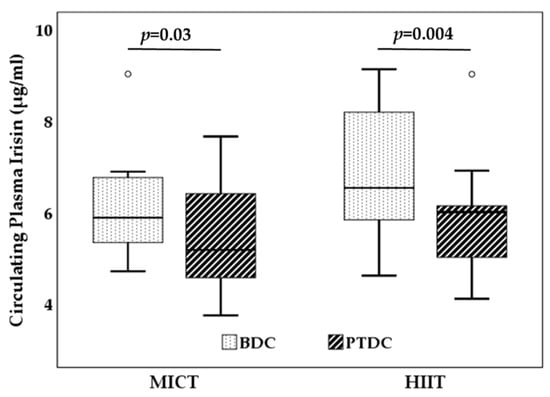 Circulating irisin levels are different after 12 weeks of training compared to baseline (BDC, 6.46 [5.59–7.02] μg/mL vs. PTDC, 5.62 [4.78–6.32], p = 0.0001). Both baseline (MICT, 5.89 [5.23–6.77] μg/mL vs. HIIT, 6.47 [5.53–8.24] μg/mL) and post-training (MICT, 5.18 [4.51–6.45] μg/mL vs. HIIT, 6.01 [4.93–6.16] μg/mL) levels of irisin did not differ between interventional groups.