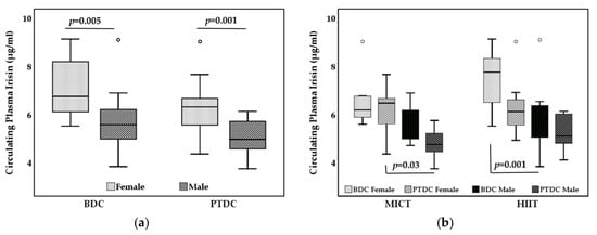 Regardless of interventional group, female obese individuals had higher baseline irisin levels than male counterpart (6.75 [6.07–8.24] vs. 5.58 [4.92–6.29] μg/mL, p = 0.005) (Figure 2a). Sex differences were also found for post-training irisin levels: females had higher post-exercise irisin levels than males (6.32 [5.51–6.75] vs. 4.97 [4.57–5.72] μg/mL, p = 0.001) (Figure 2a).