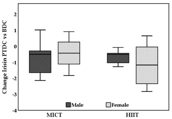 Sex-specific changes of irisin from baseline to 12 weeks are depicted in Figure 3. Here, a not statistically significant greater reduction among females underwent HIIT was observed.