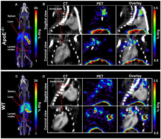 Representative PET/CT image of a ApoE−/− and WT mouse 7 days after administration of [89Zr]Zr-anti-CD40 mAb. (A,C) MIP images of ApoE−/− and WT mouse. (B,D) Tracer distribution in aorta of ApoE−/− and WT mouse: CT image (left), aortic arch indicated by red arrows, PET image (middle), and CT image overlayed with PET (right). White arrows indicate apparent uptake in plaques. Data is expressed in percent injected dose per gram tissue (%ID/g).
