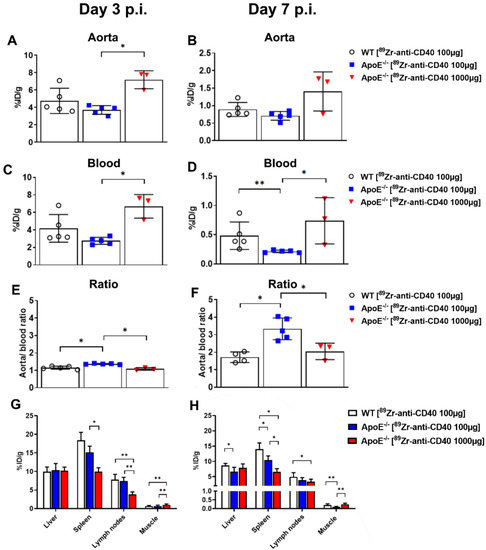 PET quantification of [89Zr]Zr-anti-CD40 mAb uptake in different organs of ApoE−/− and WT mice at day 3 and 7 p.i. (A,B) Percent injected dose per gram tissue (%ID/g) in aorta. (C,D) %ID/g in blood (measured in left ventricle). (E,F) Aorta-to-blood ratio. (G,H) Tracer uptake in liver, spleen, lymph nodes and muscle, presented as percent injected dose per gram tissue (%ID/g). (* p < 0.05, ** p < 0.01; ApoE−/− “low dose”: N = 5 at day 3 and day 7 p.i., WT N = 4 at day 3 p.i. and N = 5 at day 7 p.i., and ApoE−/−“high dose” N = 3 at day 3 and day 7 p.i.).