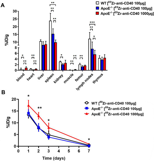 The following are available online at https://www.mdpi.com/article/10.3390/biology11030408/s1. Figure S1. Representative examples of regions of interest (ROIs) drawn on their corresponding organ. (A) ROIs drawn on liver (purple), spleen (red), lymph node (green) and muscle (yellow). (B) ROIs drawn on aorta arch (red) and left ventricle (blue). Figure S2. SE-HPLC chromatogram of formulated product [89Zr]Zr-anti-CD40mAb for injection into WT animals. Concentration of anti-CD40 mAb is 0.69 mg/mL. Top panel: radioactivity, bottom panel: UV at 280 nm. Figure S3. SE-HPLC chromatogram of formulated product [89Zr]Zr-anti-CD40mAb for injection into for ApoE−/− animals. Concentration of anti-CD40 mAb is 0.69 mg/mL. Top panel: radioactivity, bottom panel: UV at 280 nm. Figure S4. SE-HPLC chromatogram of formulated product [89Zr]Zr-anti-CD40mAb + cold antibody for injection into for ApoE−/− animals “High dose”. Concentration of anti-CD40 mAb is 4.95 mg/mL. Top panel: radioactivity, bottom panel: UV at 280 nm. Table S1. PET imaging quantifications of [89Zr]Zr-anti-CD40 mAb at day 3 p.i. in WT and ApoE−/− mice. Table S2. PET imaging quantifications of [89Zr]Zr-anti-CD40 mAb at day 7 p.i. in WT and ApoE−/− mice. Table S3. Ex vivo biodistribution of [89Zr]Zr-anti-CD40 mAb at day 7 p.i. in WT and ApoE−/− mice. Table S4. Blood kinetics of [89Zr]Zr-anti-CD40 mAb at day 1, 2, 3 and 7 p.i. in WT and ApoE−/− mice.