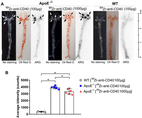 Autoradiography and Oil Red O staining of en face aortic arches demonstrate the specific binding of [89Zr]Zr-anti-CD40 mAb to plaque areas. (A) Autoradiography and Oil red O staining in both an ApoE−/− and WT mouse. Arrows indicate plaque regions. (B) Quantification of autoradiography intensity in all groups. * p < 0.05; WT N = 3, ApoE−/− “low dose” N = 5, ApoE−/− “high dose” N = 6.