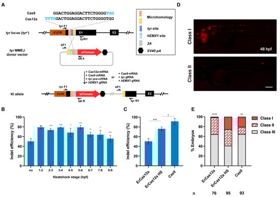 ErCas12a cleavage generally leaves sticky DNA ends, which is preferable to blunt ends for promoting homology-based DSB repair, though knockin applications have not been reported for ErCas12a. To evaluate whether ErCas12a is feasible for knockin and whether it could achieve efficiency comparable to Cas9, we identified an ErCas12a target site, which overlaps a highly efficient Cas9 target site in the tyr (tyrosinase) locus [], and compared their performance in MMEJ-mediated knockin (Figure 1A). We first examined the indel efficiency of the tyr ErCas12a site under 1 h heatshock, and found that 1 h heatshock between 1 hpf and 6 hpf was sufficient to generate indel mutations up to 80%, slightly lower than the efficiency observed with Cas9 at the overlapping tyr Cas9 site (Figure 1B,C). We thus constructed a tyr MMEJ donor plasmid with an hEMX1 Cas9 site for in vivo linearization, flanked by two 25-bp microhomology sequences, followed by a tdTomato reporter gene separated by a 2A peptide sequence (Figure 1A) [,,]. Precise in-frame integration of the donor would lead to tdTomato expression under the control of the endogenous tyr promoter, as well as disruption of tyr gene function (Figure 1A). We co-injected ErCas12a mRNA, tyr pre-crRNA, Cas9 mRNA, hEMX1 gRNA, and the tyr MMEJ donor into one-cell stage zebrafish embryos and divided them into heatshock (34 °C at 3–4 hpf) and control (no heatshock) groups. A Cas9-based knockin system containing Cas9 mRNA, tyr gRNA, hEMX1 gRNA, and the tyr MMEJ donor was also injected for comparison of ErCas12a and Cas9 knockin efficiency. It has been reported that the distribution of fluorescence correlates well with knockin efficiency []. Thus, we qualitatively classified the injected embryos into three groups (Class I, II, and III) according to their fluorescence mosaicism. We clearly observed red fluorescent signals in each injected group at 48 hpf. In the ErCas12a heatshock group, nearly 60% (58/95) embryos showed scattered tdTomato expression, with around 25% of total embryos displaying a broad expression pattern (24/95) (Figure 1D,E). Since the broad expression pattern of the reporter gene in F0 embryos often correlates with high potential for germline transmission of knockin events [,,], the knockin events generated by the ErCas12a with heatshock were likely to be heritable. In contrast, the ErCas12a control group without heatshock showed low knockin efficiency, with only 35% (27/76) of the embryos showing red fluorescence, and few embryos showed a broad pattern of tdTomato expression (Figure 1E), which is consistent with its lower indel mutagenesis efficiency (Figure 1B,C). In the group injected with the Cas9 knockin system, red fluorescent signals were observed in about 35% (33/93) of the embryos, and 20% (19/93) showed a broad pattern. Both ratios are lower than the ErCas12a heatshock group (Figure 1E), though the indel mutagenesis efficiency induced by Cas9 was higher than ErCas12a (Figure 1C). These results indicate that, like Cas9, ErCas12a is capable of promoting knockin through the MMEJ pathway.